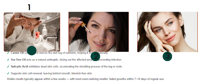 Over successive applications, the growth reportedly darkens, shrinks, and eventually detaches, leaving smoother, even-toned skin behind.